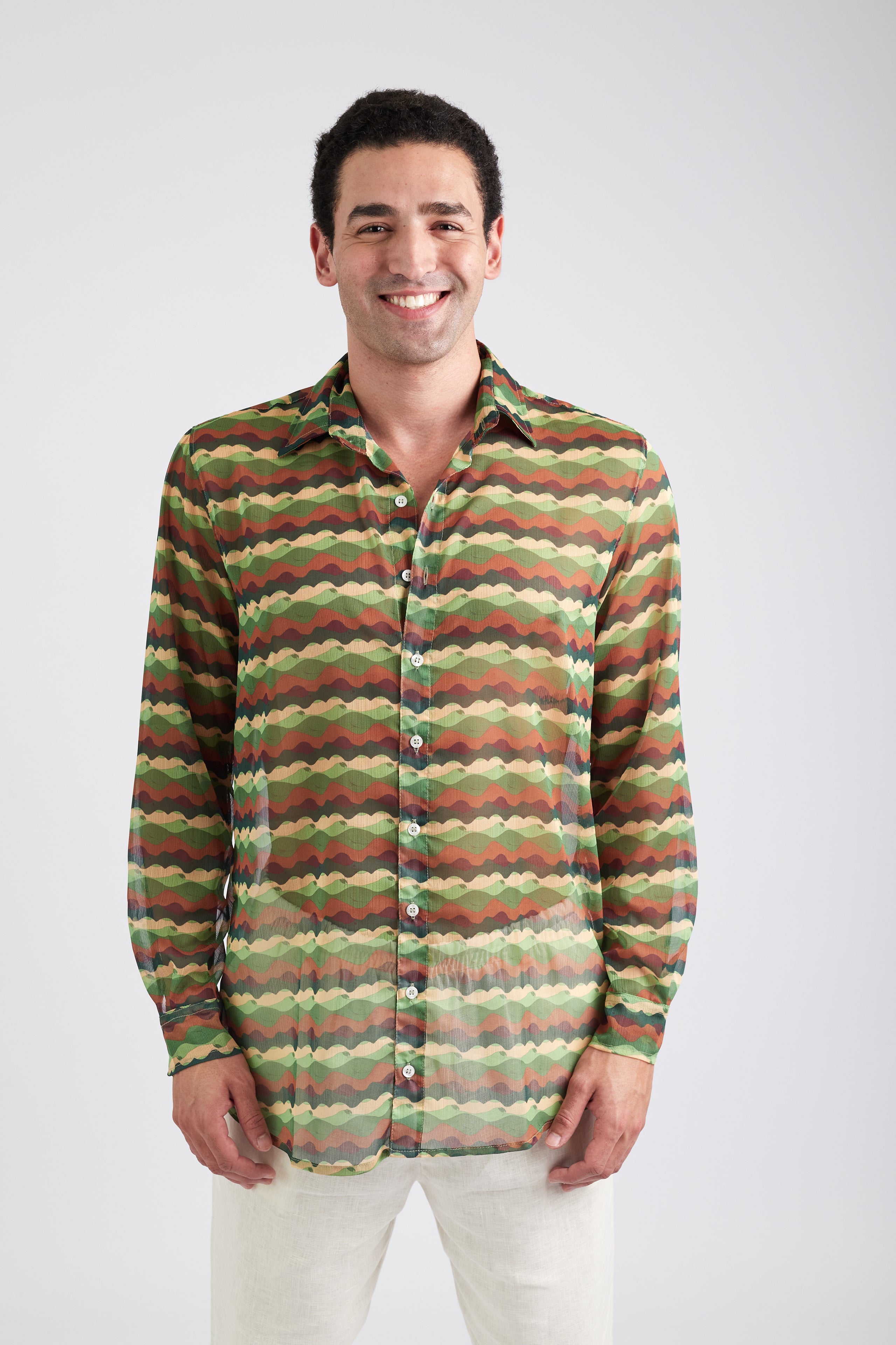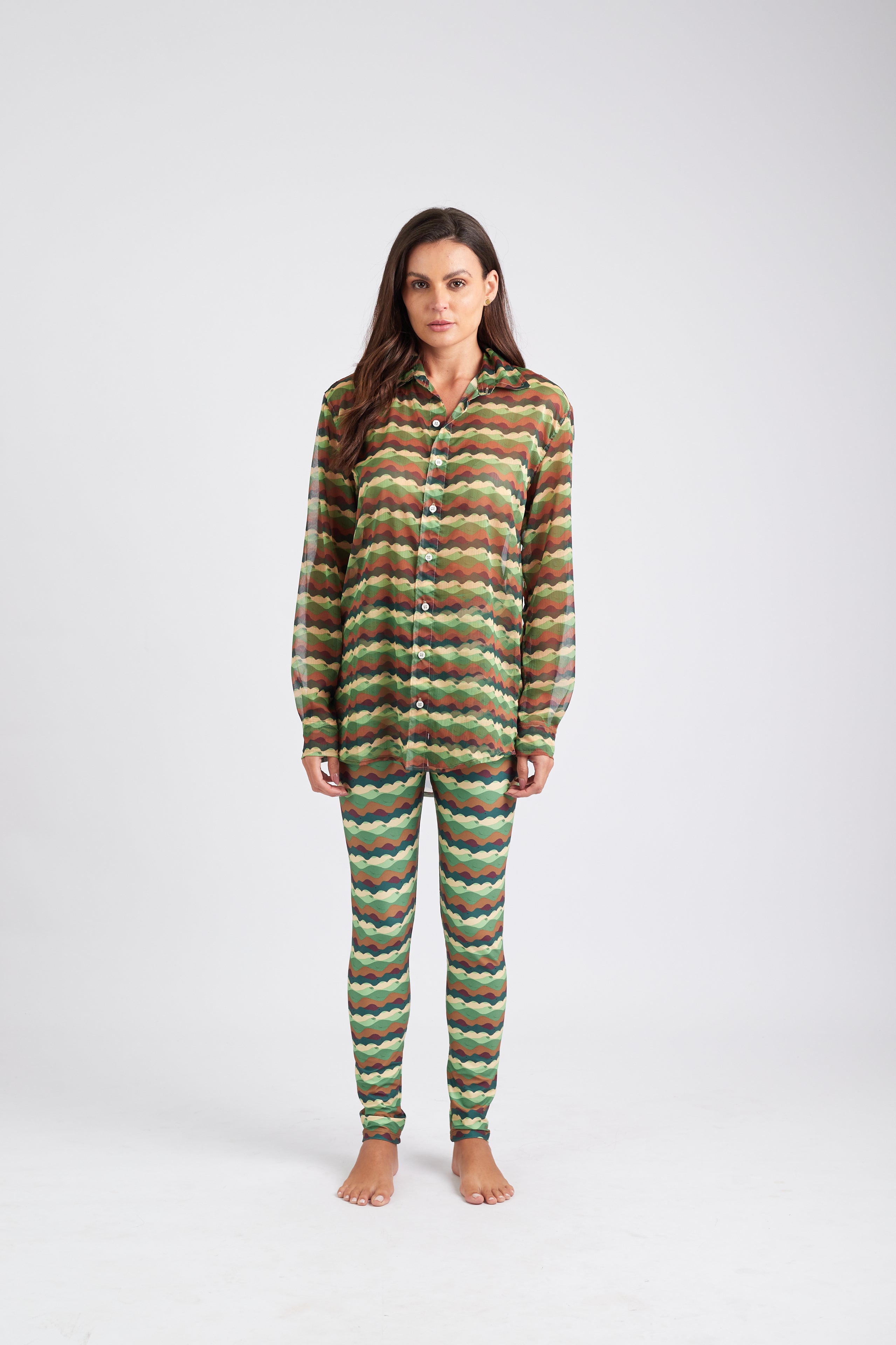 A camisa apresenta um design estampado ondas. O tecido parece leve e fluido, conferindo um visual elegante e descontraído. O corte é de estilo oversize, com mangas compridas e punhos ajustados. O fechamento frontal é feito com botões, adicionando praticidade ao modelo. É uma peça que combina modernidade com um toque romântico, ideal para diversas ocasiões.