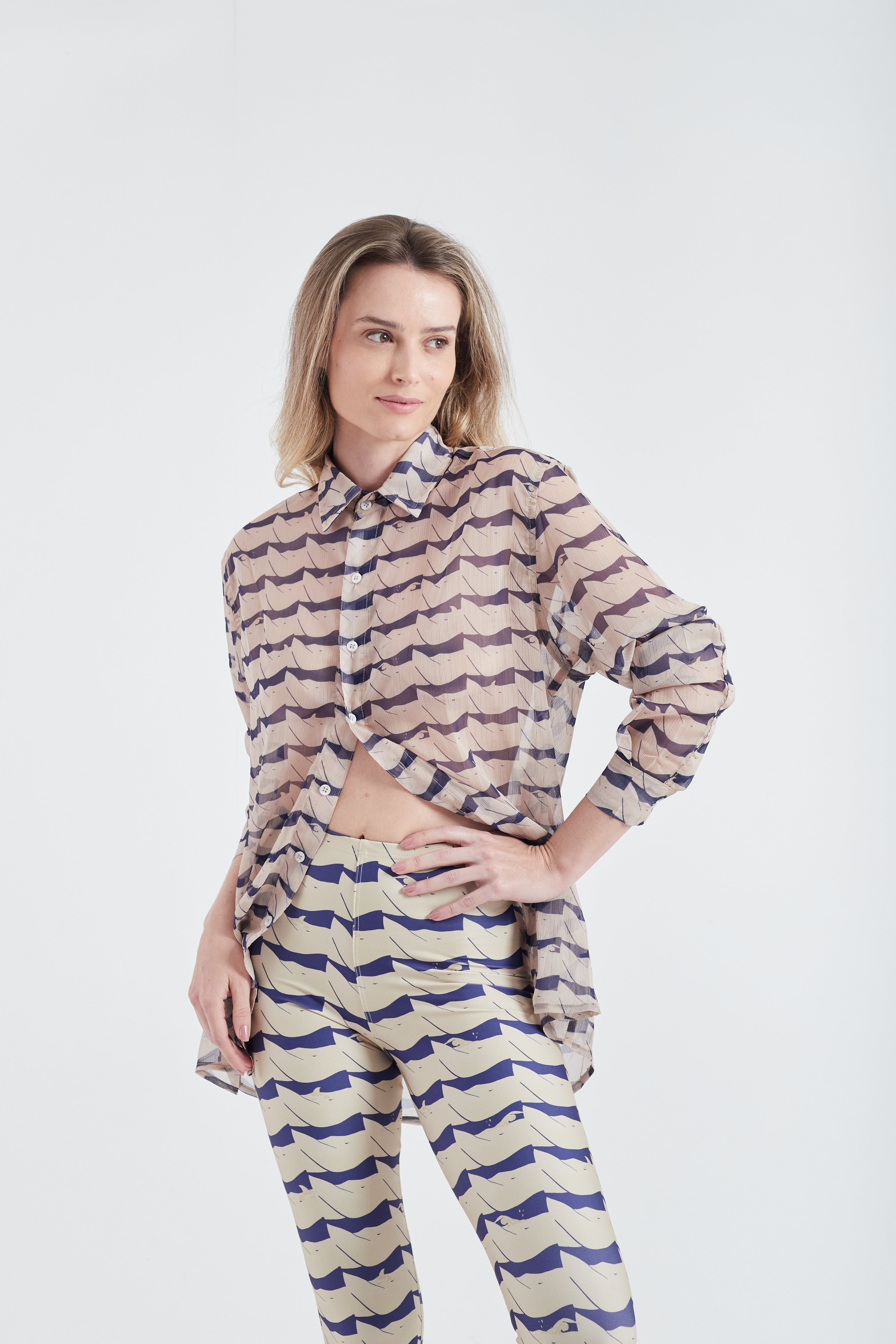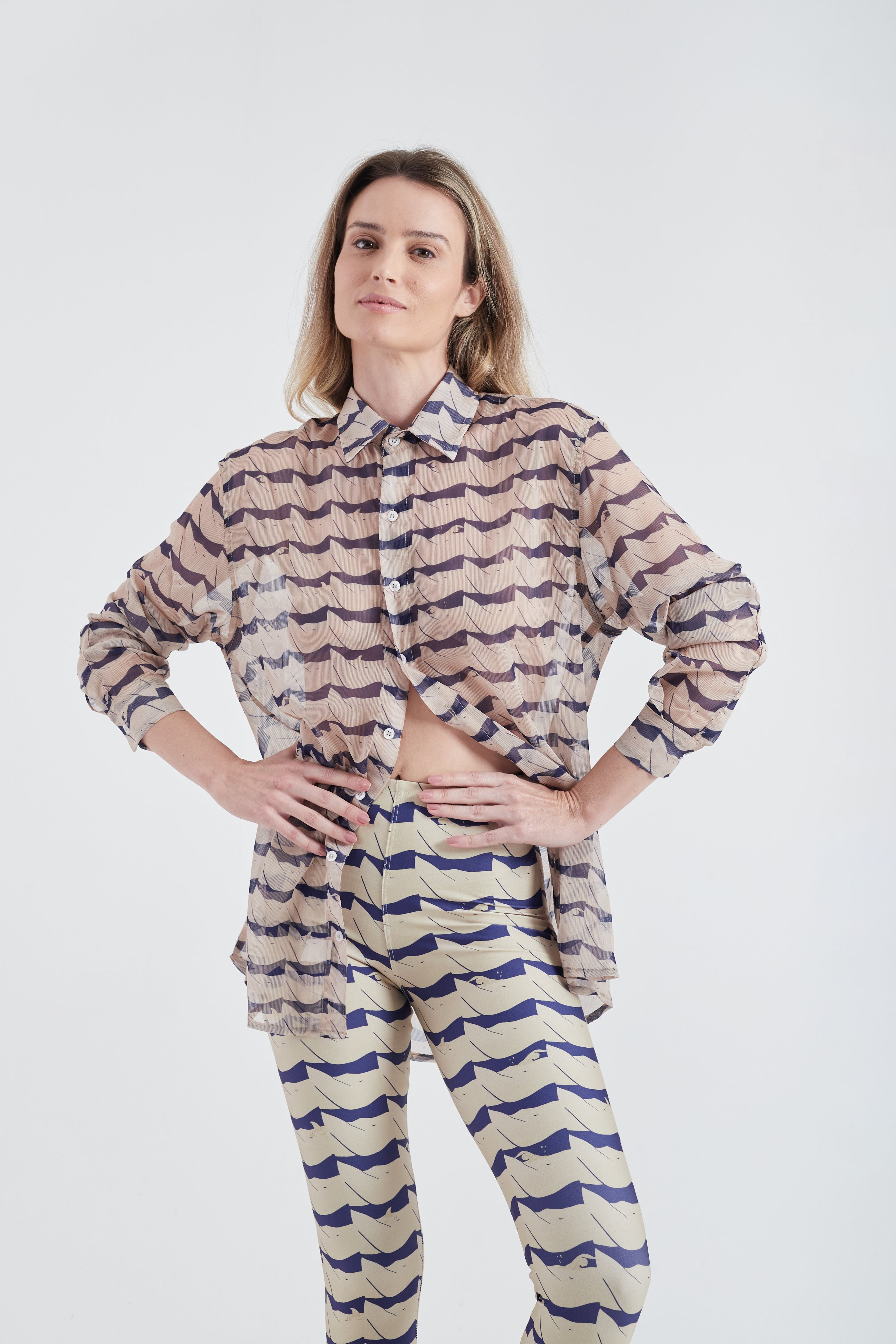 A camisa apresenta um design estampado com flores de tonalidades suaves . O tecido parece leve e fluido, conferindo um visual elegante e descontraído. O corte é de estilo oversize, com mangas compridas e punhos ajustados. O fechamento frontal é feito com botões, adicionando praticidade ao modelo. É uma peça que combina modernidade com um toque romântico, ideal para diversas ocasiões.