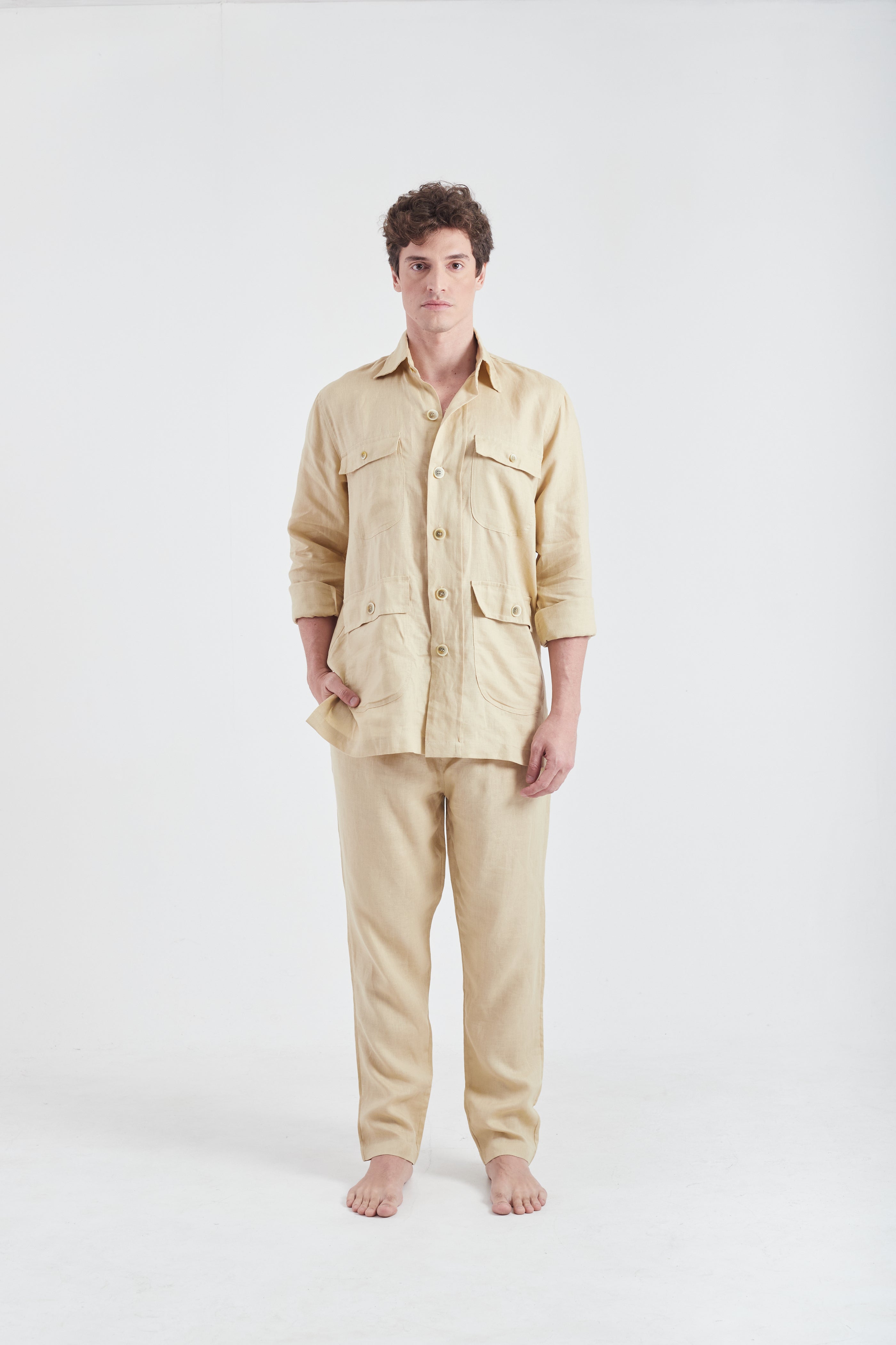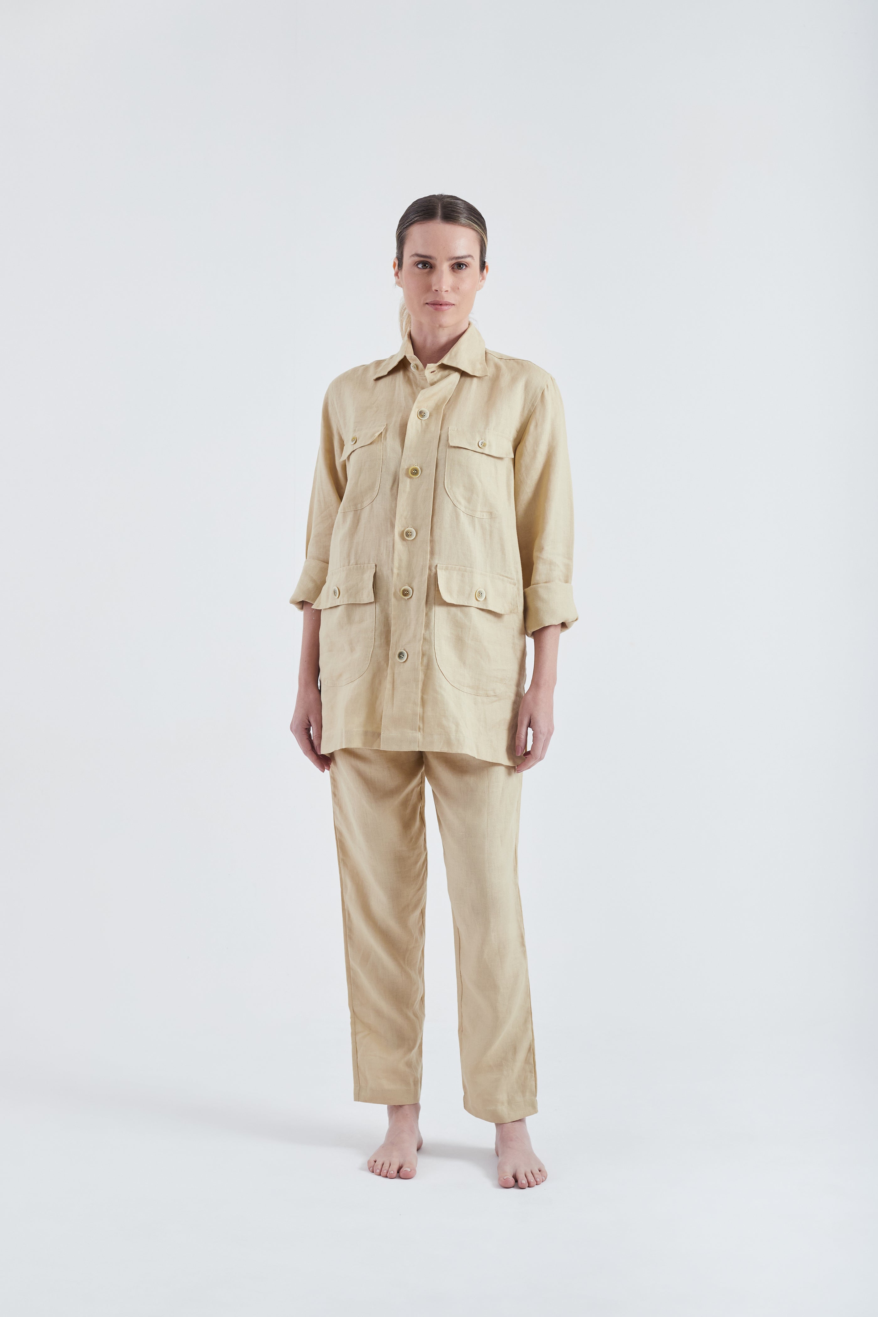 Look Safari Khaki elegância tropical com um toque funcional, explorando o estilo resort com muita personalidade e autenticidade. Esse look é uma leitura contemporânea do estilo utility chic, ideal para quem busca uma moda leve, versátil e com presença. O corte fluido e o caimento natural do linho traduzem frescor e sofisticação, sendo perfeito tanto para ambientes urbanos quanto para destinos de verão.