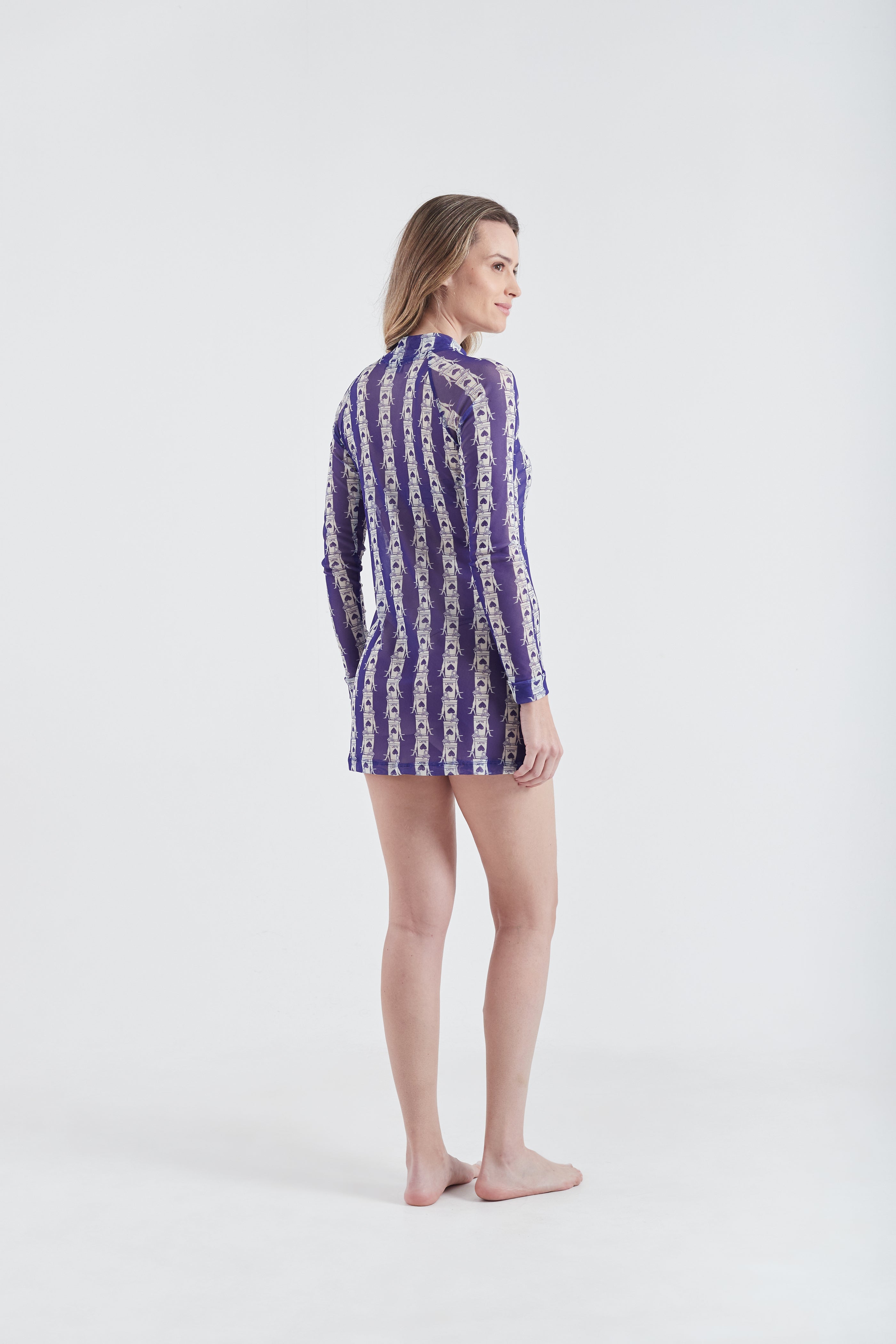 Vestido Curto oferecendo um visual moderno e sofisticado. A leveza do tecido e sua transparência sugerem que pode ser usado como saída de praia ou sobreposição para looks mais ousados. Ideal para climas quentes e ocasiões casuais ou eventos à beira-mar.