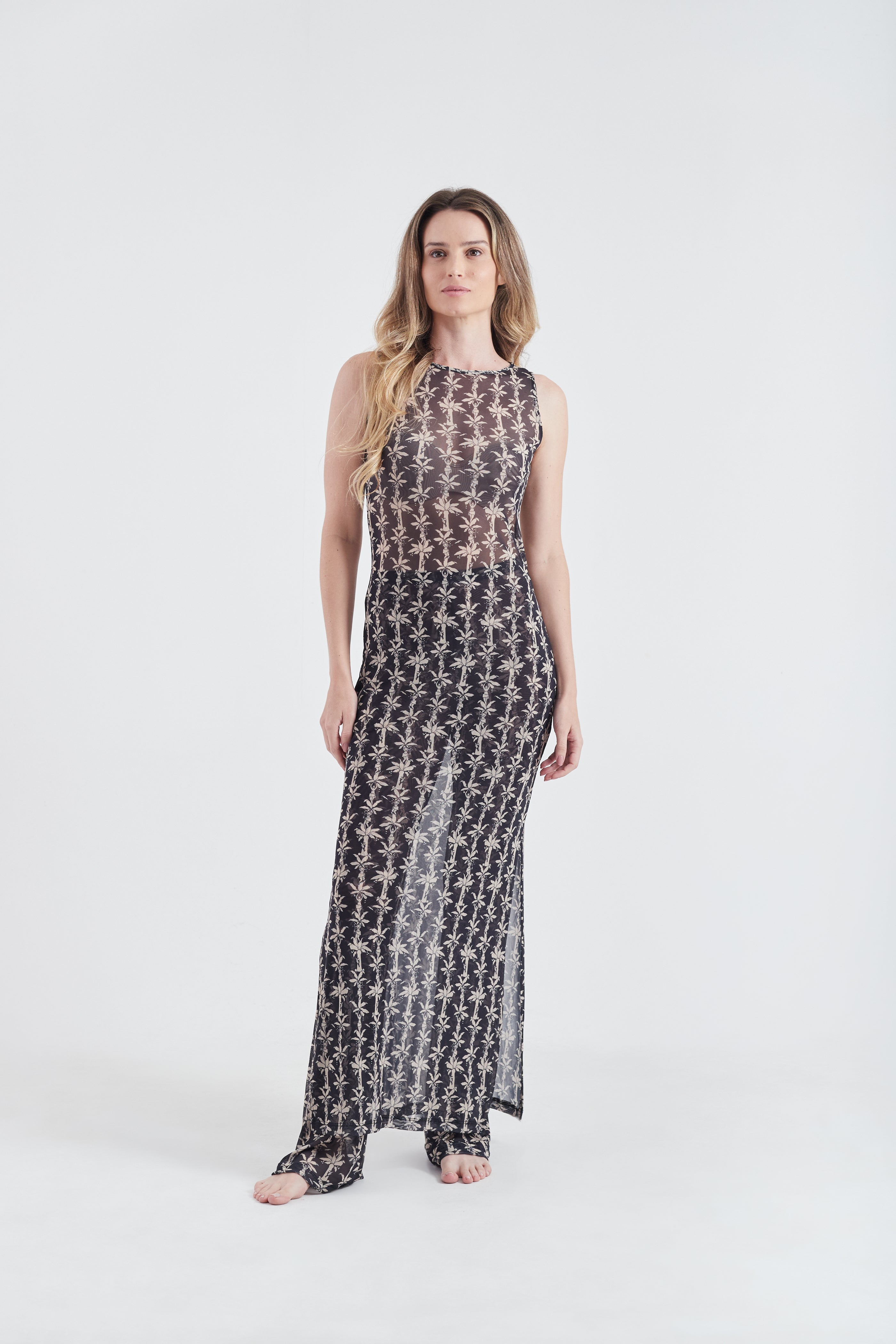 Vestido Longoi Fauna & Flora Black/Off White oferecendo um visual moderno e sofisticado. A leveza do tecido e sua transparência sugerem que pode ser usado como saída de praia ou sobreposição para looks mais ousados. Ideal para climas quentes e ocasiões casuais ou eventos à beira-mar.