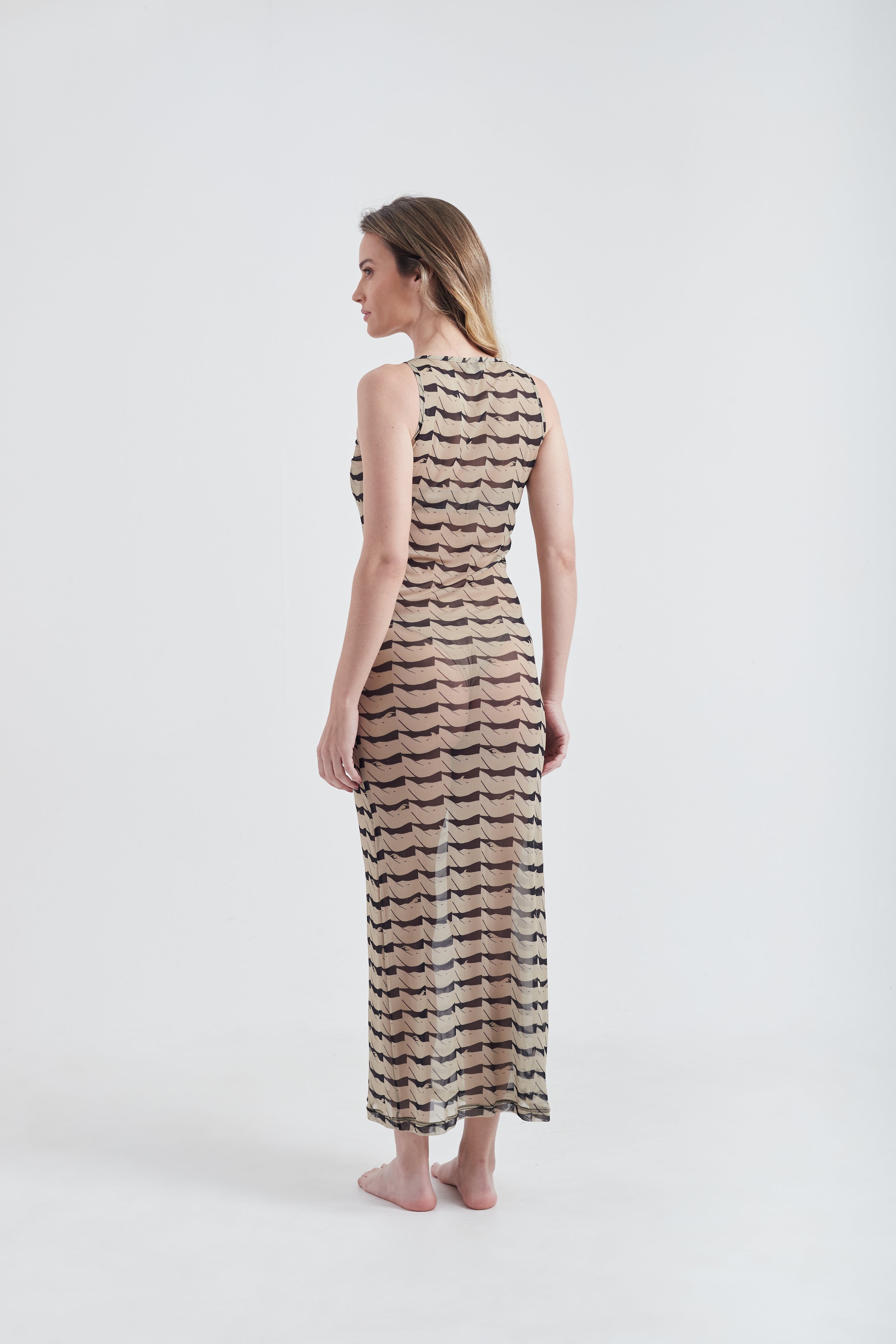 O Vestido Longo Regata High Tide e justo ao corpo, confeccionado em tecido transparente com estampa em tons de bege e preto. A estampa apresenta um padrão geométrico repetitivo que lembra formas onduladas ou abstratas.