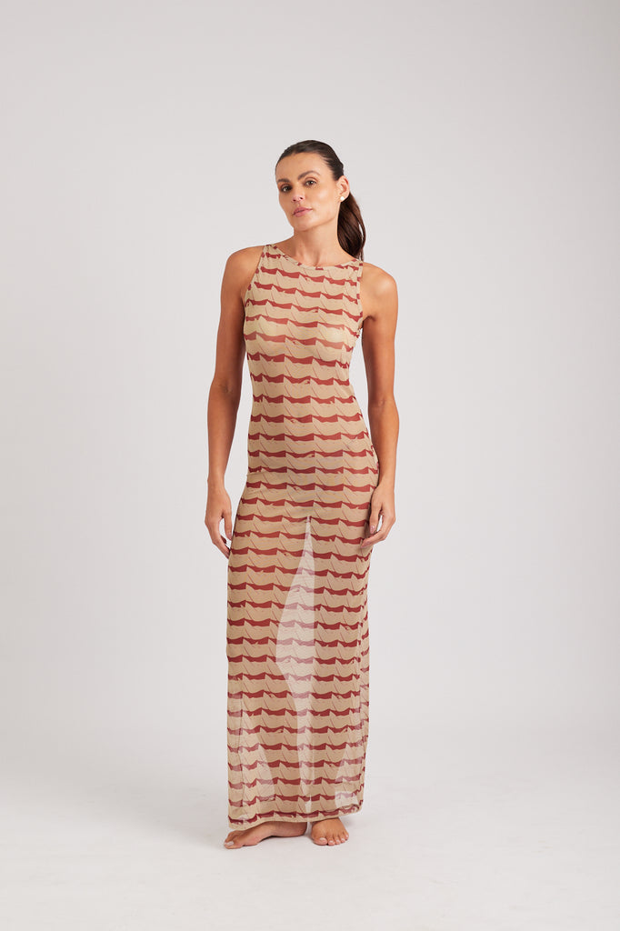 O Vestido longo e justo ao corpo, confeccionado em tecido transparente com estampa em tons de bege e vermelho. A estampa apresenta um padrão geométrico repetitivo que lembra formas onduladas ou abstratas.