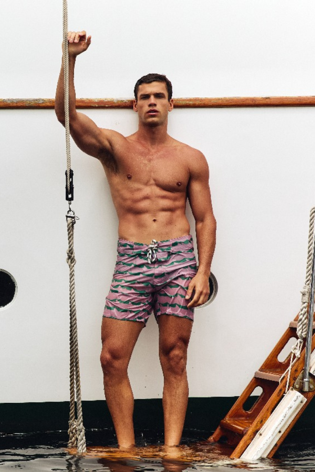 Modelo usando Board Shorts. Com um tecido tecnológico que une poliéster e elastano, oferece alta elasticidade e conforto para todas as atividades, seja na praia, piscina ou até na academia. O forro interno em poliamida garante suporte e respirabilidade, enquanto o design leve e de secagem rápida assegura praticidade e estilo. Sua estampa em formas geometricas cortadas a mão é uma elegância.
