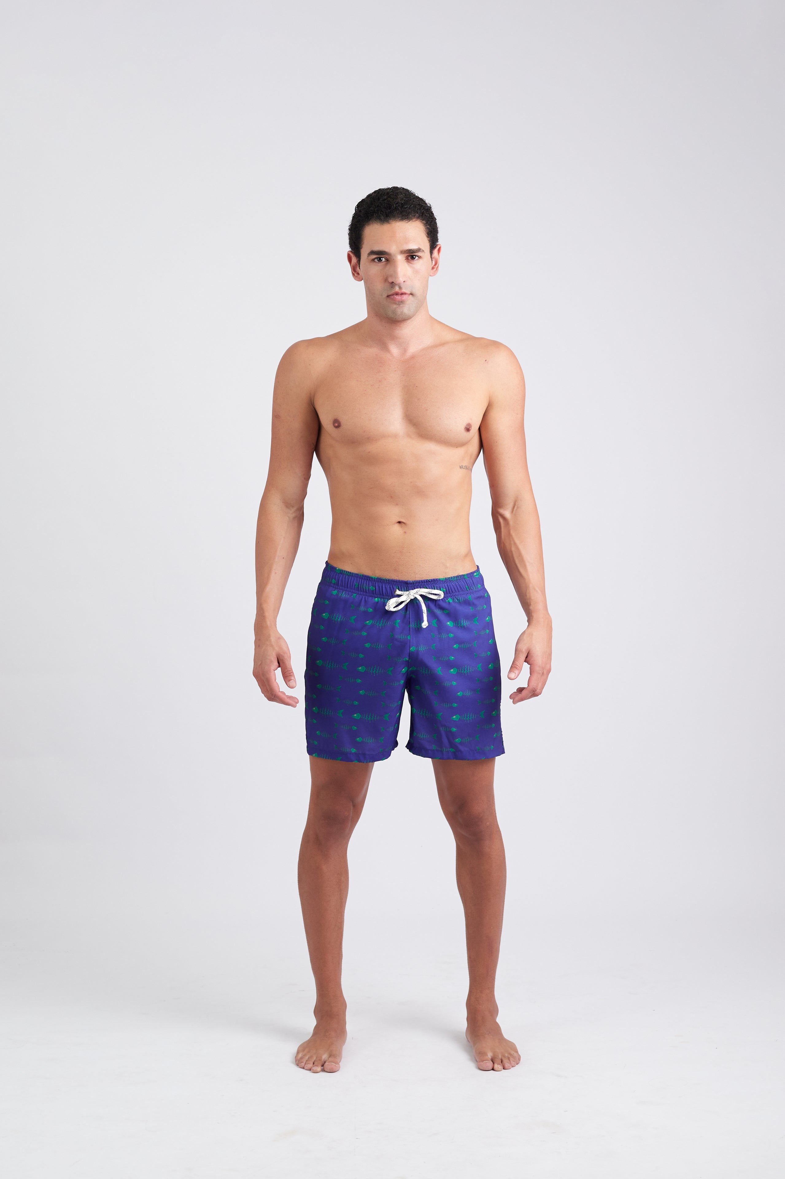 Shorts Something Fishy Azul: funcionalidade com um toque de descontração. Apresenta uma estampa de peixes em tons de verde sobre fundo azul marinho, ideal para quem busca conforto e praticidade. Feito com material tecnológico e forro de rede em poliamida, proporciona leveza e respirabilidade. O elástico no cós garante um ajuste seguro, perfeito para dias na praia, piscina ou academia.