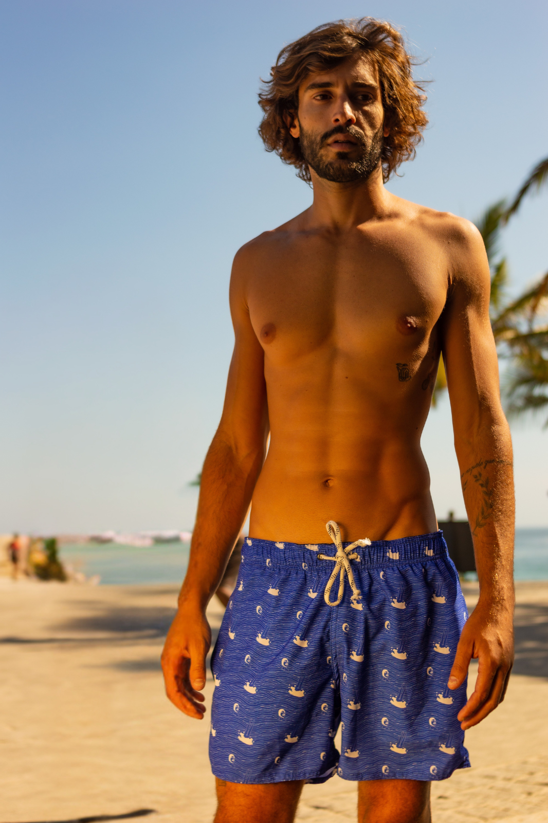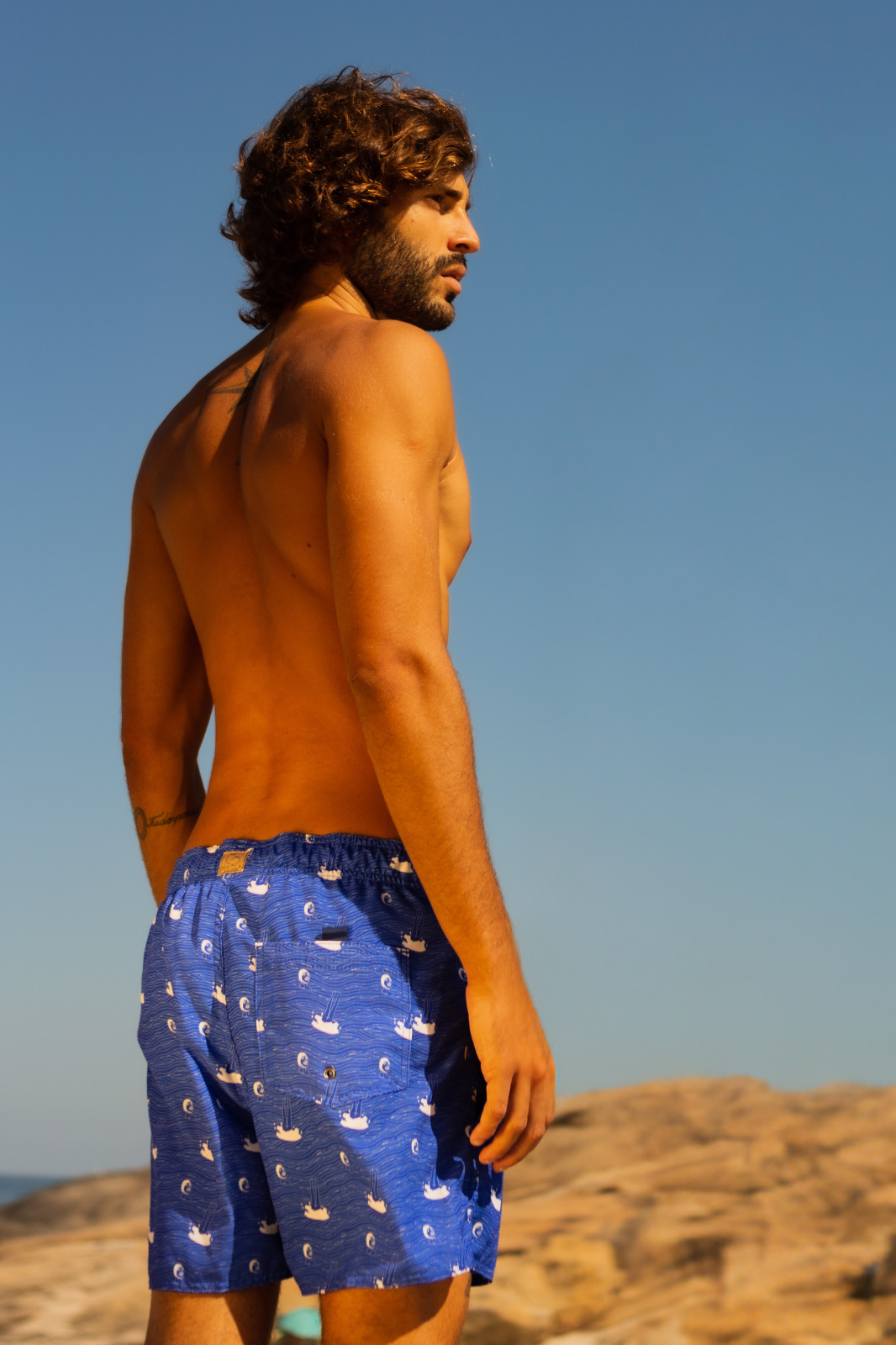 Shorts Al dente Azul e cheio de personalidade sobre o universo praiano. O design mistura silhuetas, cenas descontraídas de banho no mar, cadeiras de praia e elementos icônicos do verão, criando um padrão divertido e contemporâneo. Com conforto máximo, Apresenta elástico no cós e forro de rede em poliamida. Ideal para praia, piscina e festas ao ar livre.