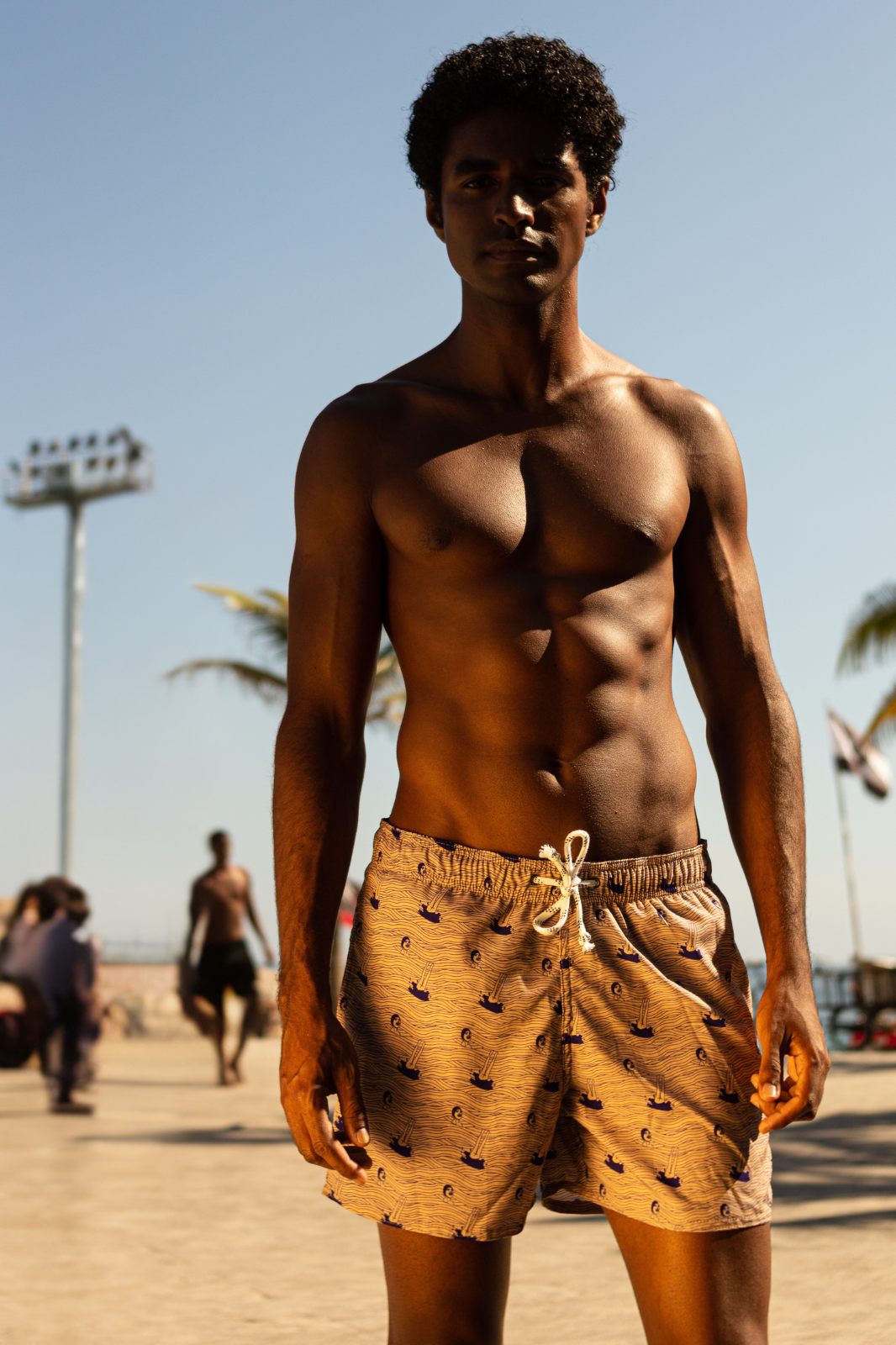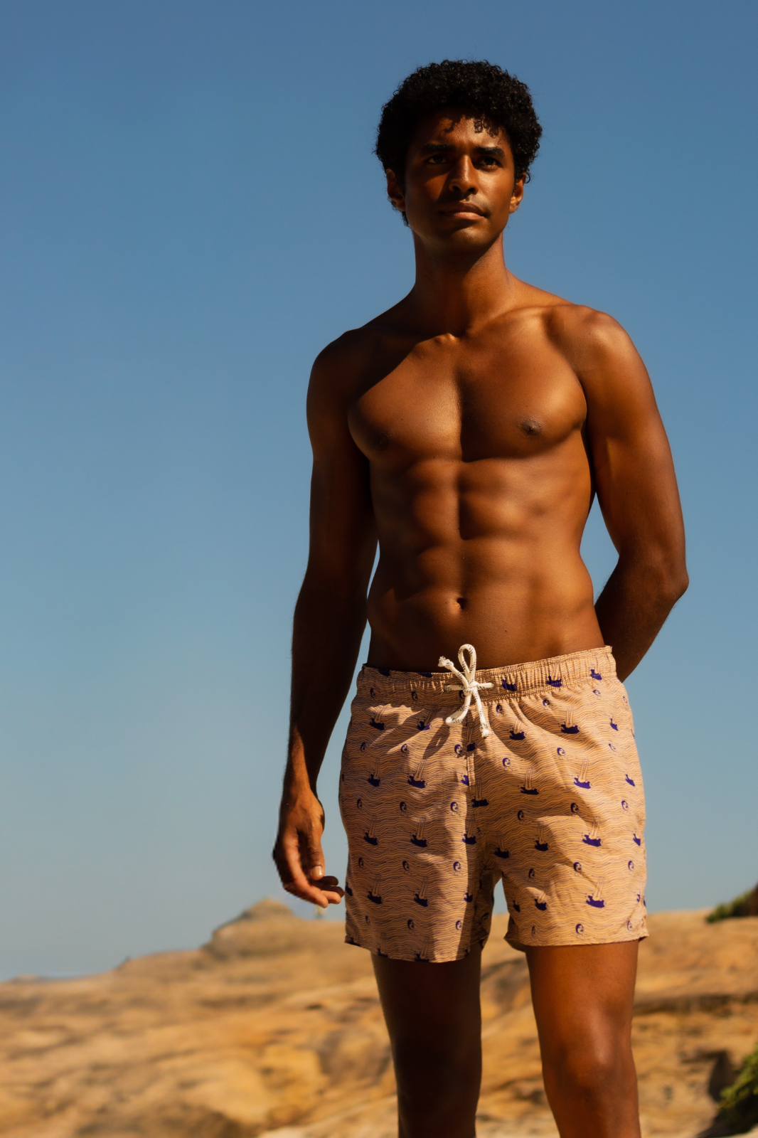 Shorts Al dente Khaki e cheio de personalidade sobre o universo praiano. O design mistura silhuetas, cenas descontraídas de banho no mar, cadeiras de praia e elementos icônicos do verão, criando um padrão divertido e contemporâneo. Com conforto máximo, Apresenta elástico no cós e forro de rede em poliamida. Ideal para praia, piscina e festas ao ar livre.