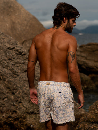 Shorts Gelato Off-White cheio de personalidade sobre o universo praiano. O design mistura silhuetas, cenas descontraídas de banho no mar, cadeiras de praia e elementos icônicos do verão, criando um padrão divertido e contemporâneo. Com conforto máximo, Apresenta elástico no cós e forro de rede em poliamida. Ideal para praia, piscina e festas ao ar livre.