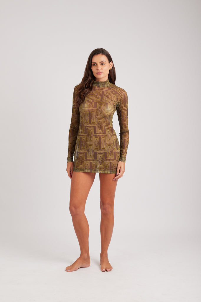Vestido Curto Mão Pela Perna Verde/Marrom
