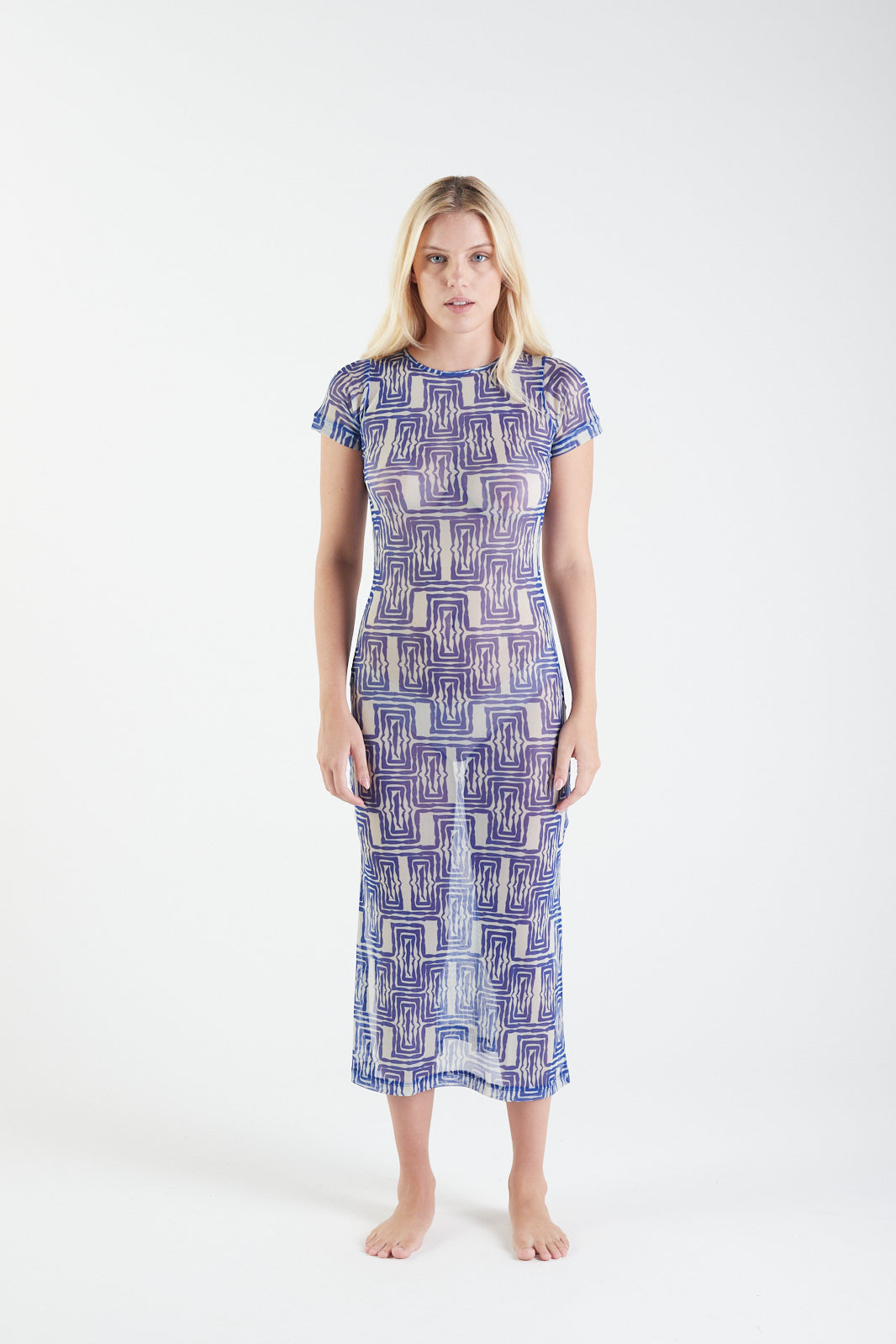 The long, form-fitting dress is made of sheer fabric with a green print. The print features a repetitive geometric pattern reminiscent of wavy or abstract shapes.