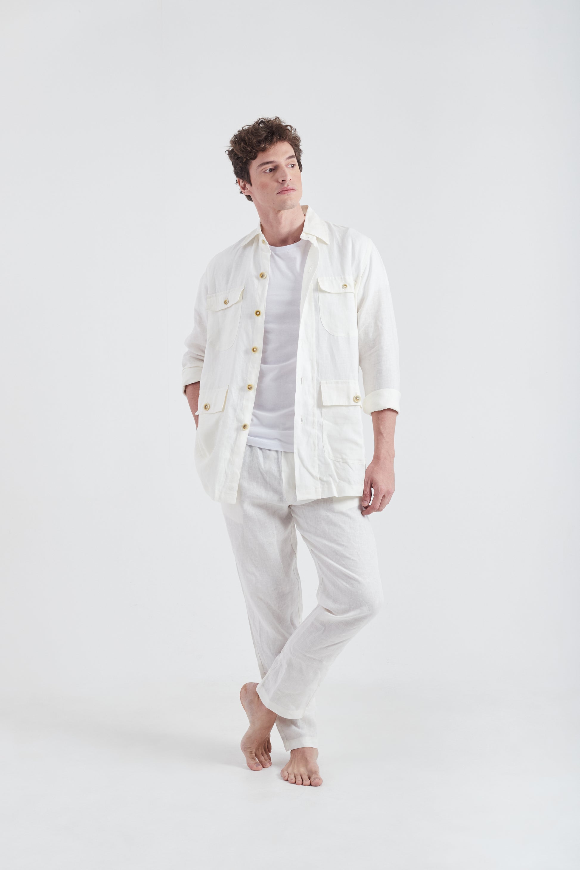 Look Safari All White elegância tropical com um toque funcional, explorando o estilo resort com muita personalidade e autenticidade. Esse look é uma leitura contemporânea do estilo utility chic, ideal para quem busca uma moda leve, versátil e com presença. O corte fluido e o caimento natural do linho traduzem frescor e sofisticação, sendo perfeito tanto para ambientes urbanos quanto para destinos de verão.
