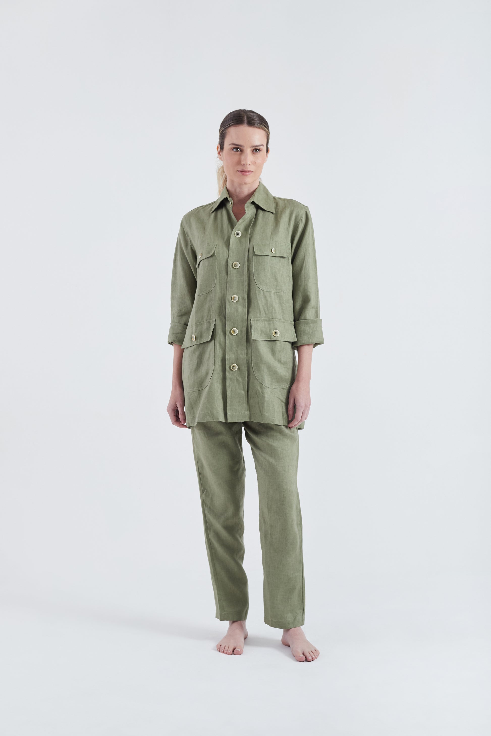 Look Safari OLIVA elegância tropical com um toque funcional, explorando o estilo resort com muita personalidade e autenticidade. Esse look é uma leitura contemporânea do estilo utility chic, ideal para quem busca uma moda leve, versátil e com presença. O corte fluido e o caimento natural do linho traduzem frescor e sofisticação, sendo perfeito tanto para ambientes urbanos quanto para destinos de verão.