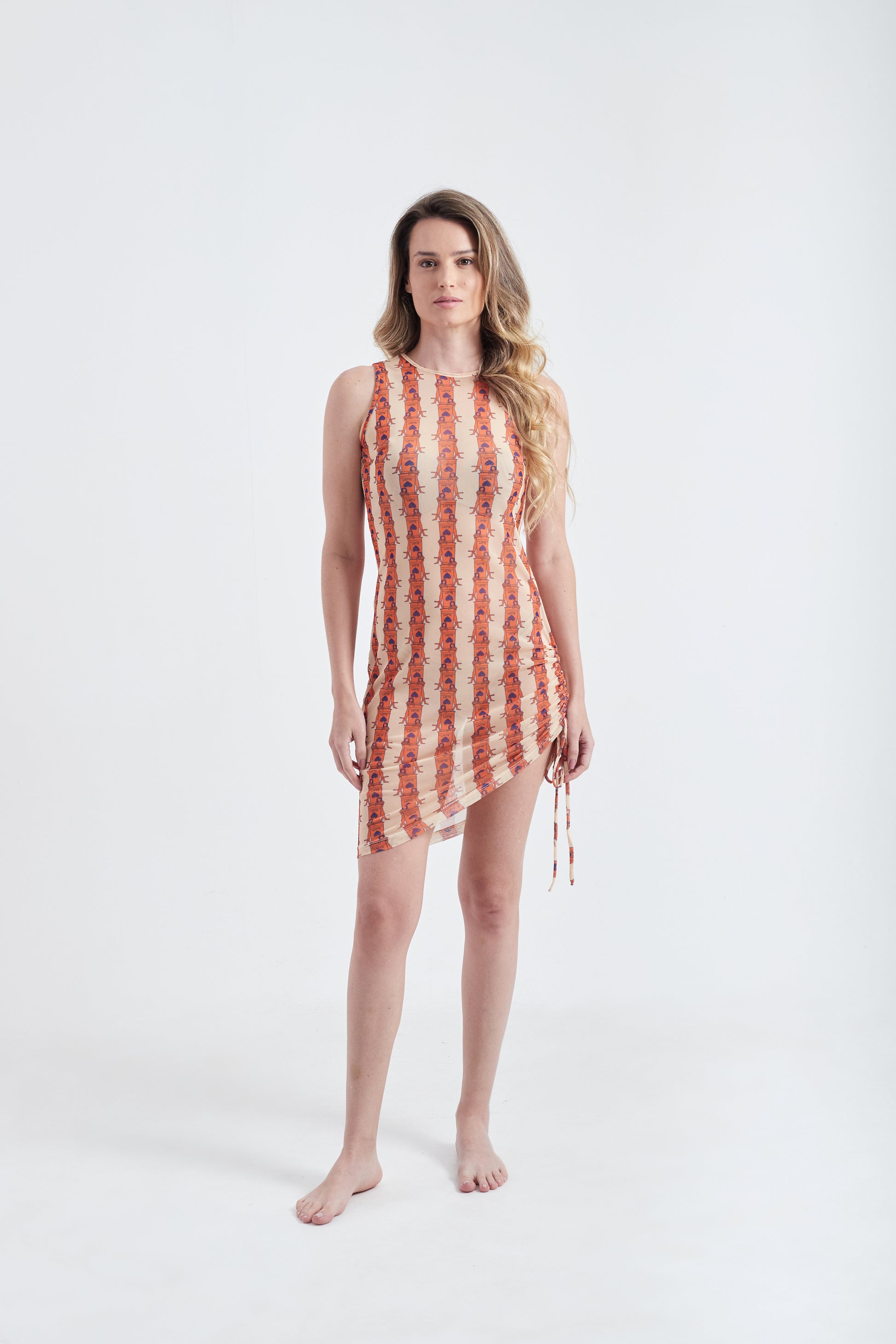 Vestido Olha o Latte Laranja drapeado oferecendo um visual moderno e sofisticado. A leveza do tecido e sua transparência sugerem que pode ser usado como saída de praia ou sobreposição para looks mais ousados. Ideal para climas quentes e ocasiões casuais ou eventos à beira-mar.